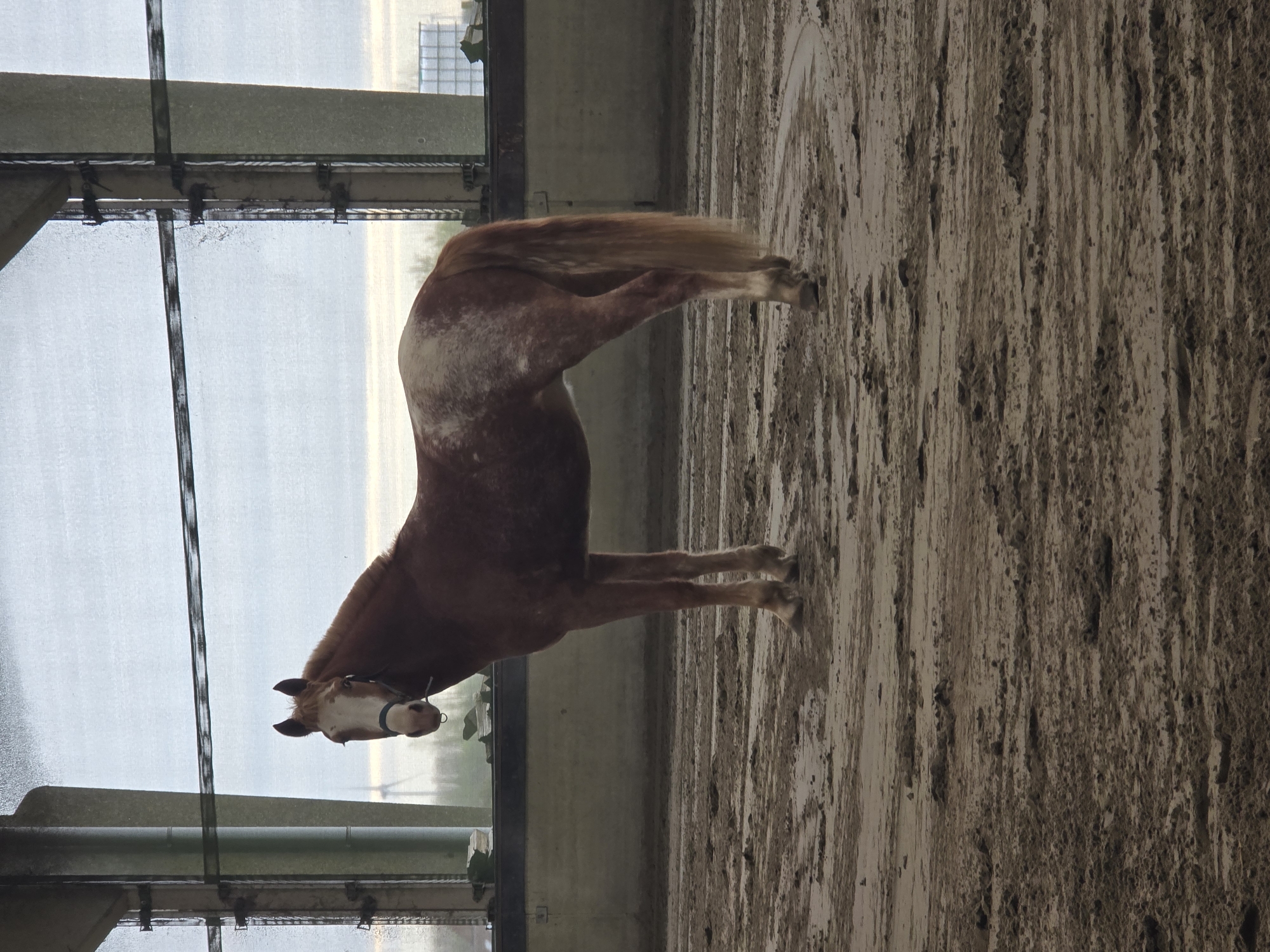 The image depicts a single horse standing within what appears to be an indoor riding arena. The specific location within the city of Estaimpuis, Belgium, is not discernible from the visual evidence. The horse is a chestnut or sorrel equine, exhibiting extensive roan or sabino patterning with white flecks and patches prominent over its hindquarters, flank, and belly. Its mane and tail are long and a lighter flaxen or blonde color. The horse has a broad white blaze on its face and is wearing a dark blue or black halter with a metal ring positioned below its chin. It stands four-square on a sandy, churned footing, facing the left side of the frame with its head turned to face the viewer. No human figures are present. The arena interior features a lower concrete or cinder block wall, painted light grey, topped by large, translucent window panels or sheeting that extend upwards, allowing diffused natural light. Visible structural elements include vertical support posts and horizontal beams, some appearing weathered. The floor is composed of uneven, disturbed sand, indicating recent activity. Through the translucent window panels in the background, an overcast sky is visible. Distant outdoor elements include a wind turbine on the left horizon and a large white, cuboid industrial or agricultural structure, possibly a water tank, on the right horizon. Minimal vegetation is also present in the distant background.