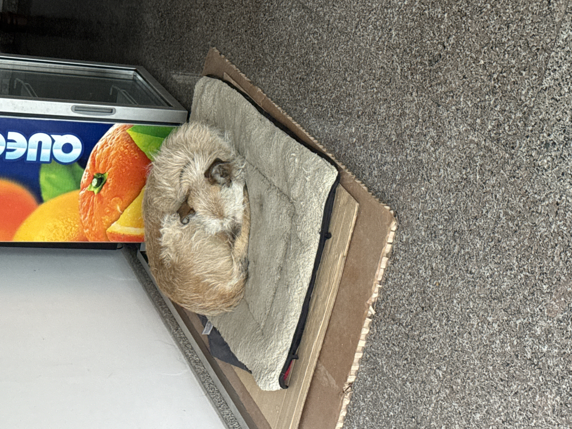 - "A medium-sized, light brown, shaggy-haired dog is observed sleeping, curled tightly into a ball, on a beige fleece dog bed" by FM-X0PNe2, licensed under CC BY 4.0