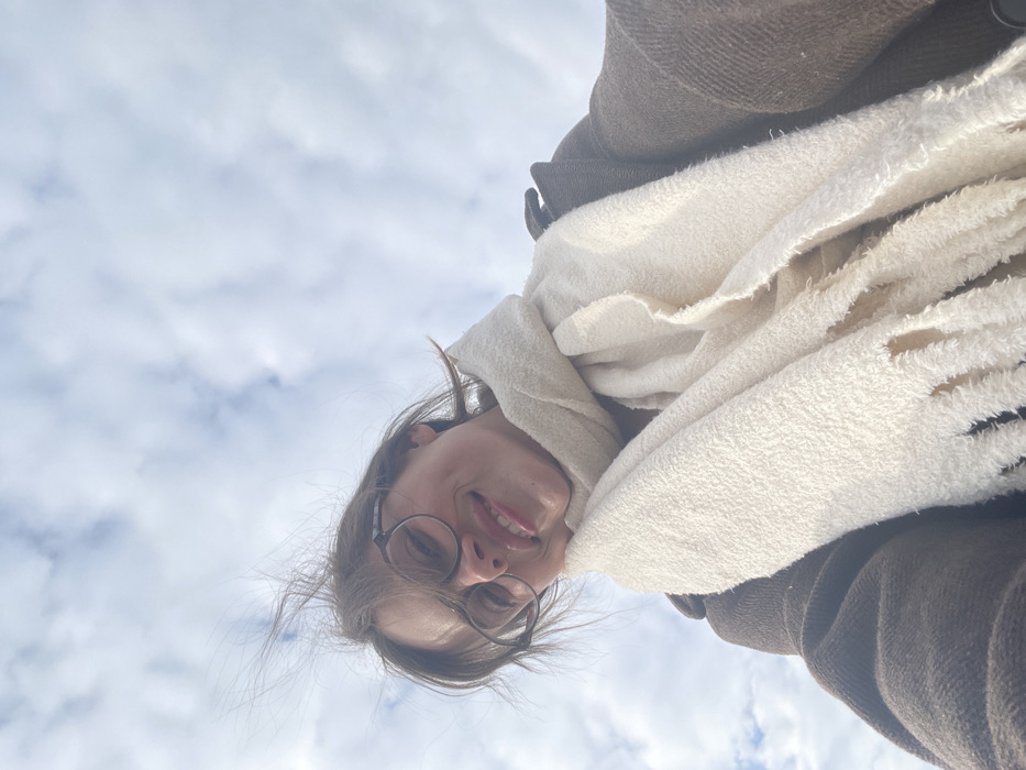 The image presents a low-angle, head-and-shoulders portrait of a young adult female. She is looking upwards and directly at the camera, displaying a smile with teeth. She wears round-framed eyeglasses. Her brown hair is slightly wind-blown, with strands visible above her head. She is dressed in a dark brown or charcoal-colored coat and a thick, cream-colored, textured scarf wrapped around her neck, featuring fringed edges. The background consists solely of an overcast sky with scattered white and light blue clouds. The specific location within Salerno, Italy, is not visually identifiable from the provided image content.