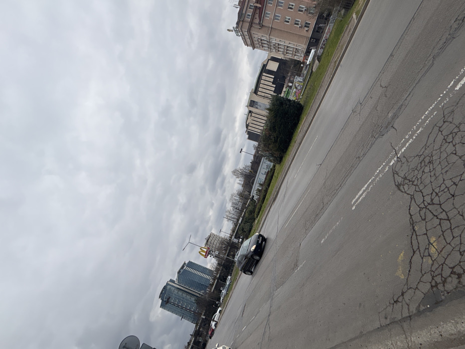 This image depicts an urban street scene in Sofia, Bulgaria, specifically identifiable by the Capital Fort twin towers and Hotel Pliska, suggesting the area around Tsarigradsko Shose boulevard. The scene is observed under an overcast sky, with dense grey clouds covering the entire upper frame. In the foreground, a multi-lane asphalt road with visible cracking and faded white lane markings extends from the bottom left towards the upper right. A dark-colored (likely black) small hatchback car, possibly a Peugeot 206, is in motion, traveling from the mid-right towards the mid-left of the frame, with its headlights illuminated. To the left of the road, several parked vehicles are visible in the distance near the base of two prominent, modern, tall glass-fronted office buildings (Capital Fort). A distinctive yellow McDonald's arch logo on a pole is positioned closer to the viewer, to the right of these modern towers. To the right of the road, a green median strip with bushes and bare trees separates the thoroughfare from a series of buildings. Behind the median, an older, light-colored, multi-story building with numerous windows, balconies, and air conditioning units is visible, identified by a "HOTEL" sign on its roof (Hotel Pliska). Graffiti is present on the lower facade of this building. To its left, a dark-colored commercial building with striped vertical elements is situated. No individuals are clearly discernible in the scene. The overall environment suggests an urban landscape during daytime with muted lighting due to the heavy cloud cover, potentially in late autumn, winter, or early spring given the bare trees.
