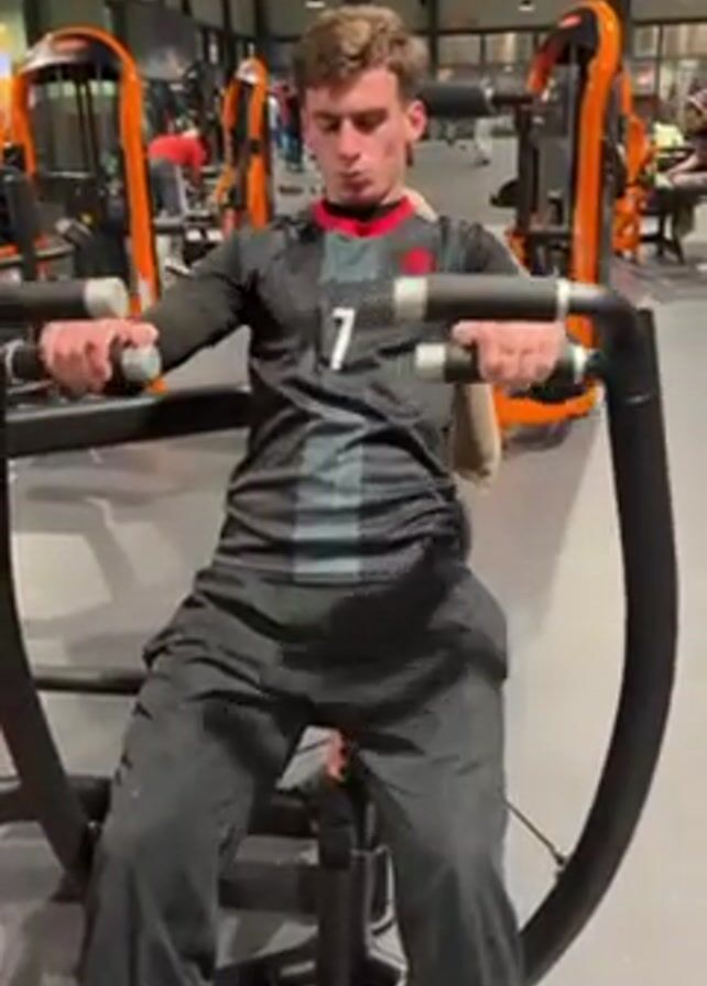 A young man is working out on a chest press machine at a gym. He is wearing a black long sleeve shirt with the number "7" on it, and black sweatpants. He sticks his tongue out and smiles at the camera as he continues his workout. The gym has orange colored weight machines. There are other people working out in the background.
