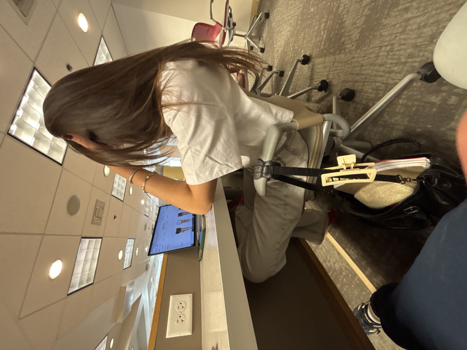 The image displays an indoor scene, likely within a modern public or institutional building in Wellesley, United States. A person with long, dark brown hair, wearing a white short-sleeved t-shirt and light-colored pants, is seated in a light grey office chair at a light-colored desk. Their right hand is raised, with fingers touching the side of their head, and a silver bracelet is visible on their right wrist. Red footwear is partially visible beneath the desk. An open laptop, displaying an e-commerce website with images of shorts, is positioned on the desk in front of them, alongside a green-cased mobile phone. A white duplex electrical outlet is mounted on the wall to the left of the laptop. A black shoulder bag, with a cream-colored hair claw clip attached to its strap, hangs from the back of the seated person's chair. Contents visible within the bag include a gold-colored object and a notebook. The ceiling features square fluorescent light panels and circular recessed lights. The floor is carpeted in grey. In the background, several office chairs with red seats and chrome bases are visible. The image is captured from a low angle, with the lower legs and dark sneakers of a second individual visible in the immediate foreground.