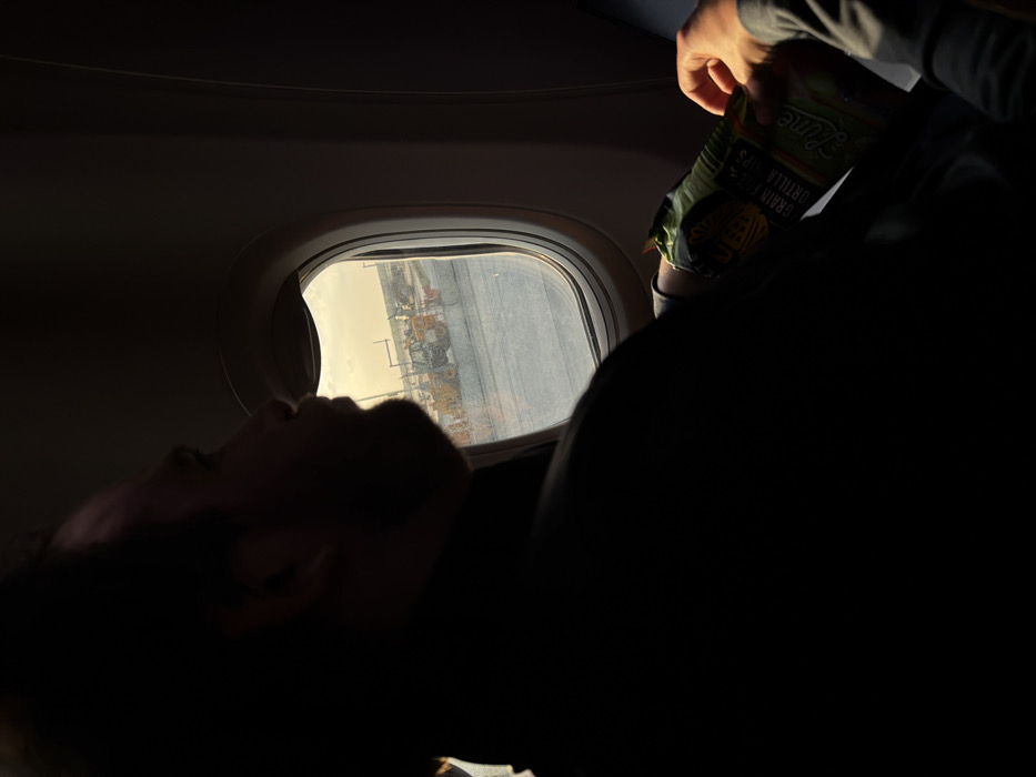 - "An interior airplane cabin scene shows a single individual seated beside an oval window, primarily in silhouette, facing right and looking out" by FM-FIUtB3, licensed under CC BY 4.0