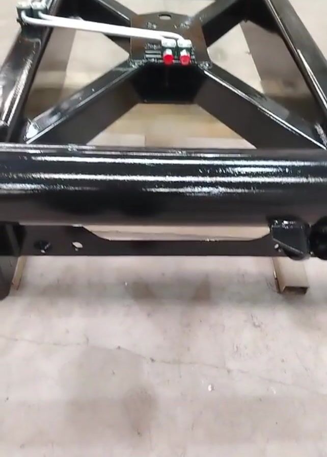 black rectangular frame with diagonal supports, possibly a trailer frame, sitting on short wooden blocks on a concrete floor