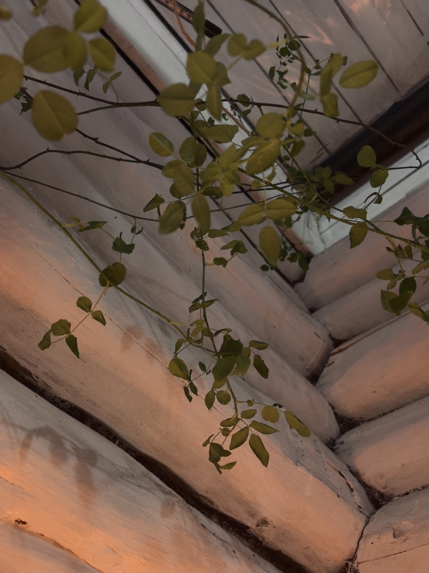 close-up view of a corner of a wooden structure, possibly a building or cabin, likely located in Noviy, Russia. The structure is made of stacked, round logs. A vine-like plant with green leaves is growing on the structure. The lighting is dim, with a warm, orange-yellow cast on the lower portion of the logs, suggesting an artificial light source. The upper part of the logs appears to be white. The scene seems devoid of people or animals. The logs show signs of age or weathering, as evidenced by dirt and debris in the seams.