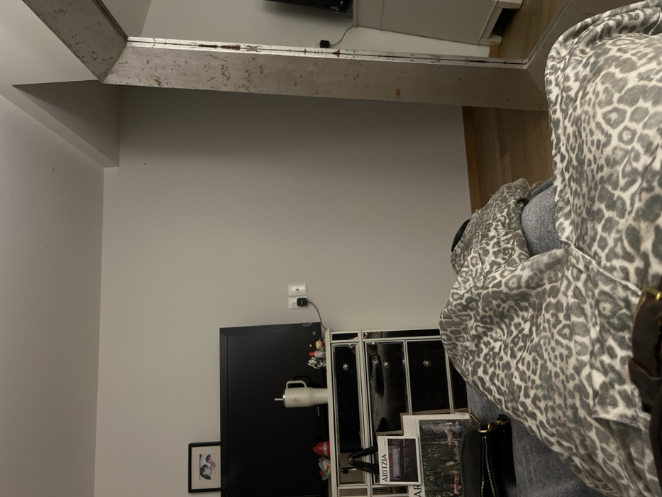 A living room features a television, a mirrored cabinet, and a picture frame on the floor. The TV screen reflects light, positioned on a wall. Magazines or books are stacked next to a black handbag. A gray leopard print jacket is draped over the corner of a chair. An architectural element, possibly a structural beam, is visible across the ceiling.