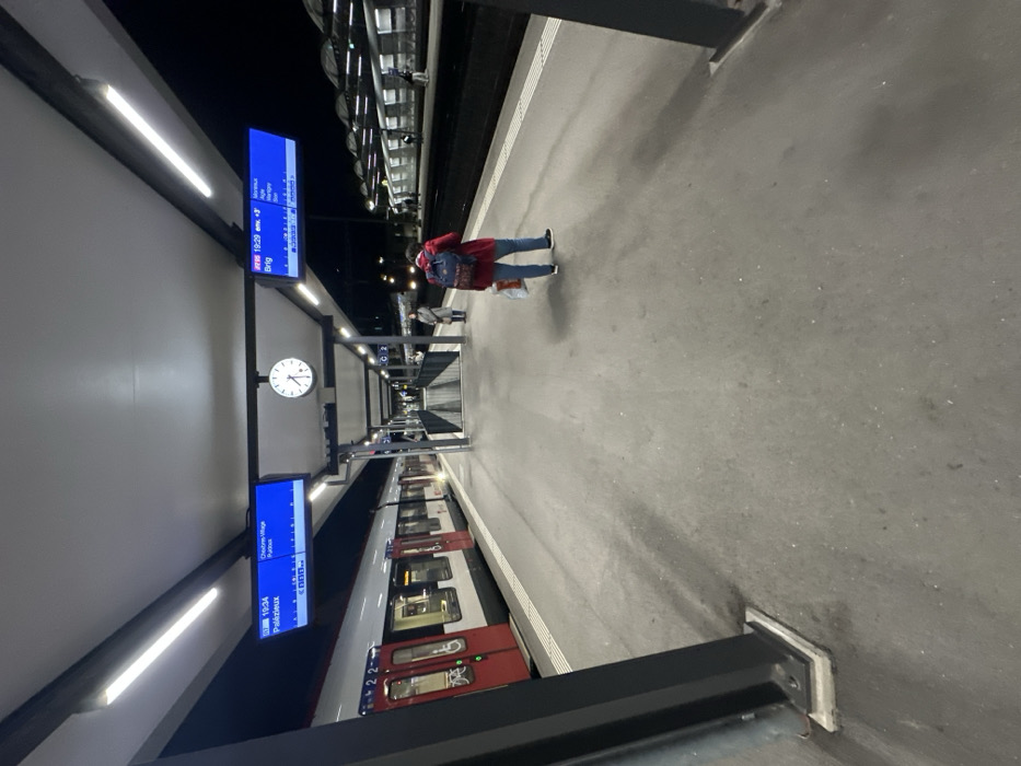 The image captures a night scene at a train station platform in Vevey, Switzerland