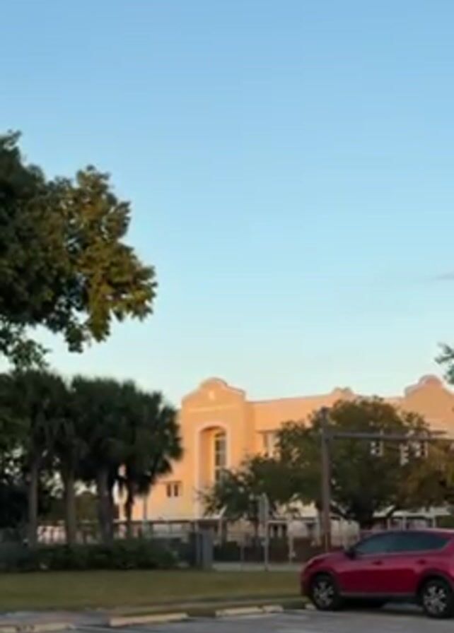 The video opens with a long shot of a light-yellow two-story building bathed in warm morning light. A red SUV is parked nearby. Trees are silhouetted in the foreground. The camera pans left, showing a larger green tree and revealing the rest of the scene, including a cloudless blue sky and the faint contrail of an airplane. The camera continues to pan left, concluding with a low single-story building that looks like a portable classroom or office. The sky is a light blue.
