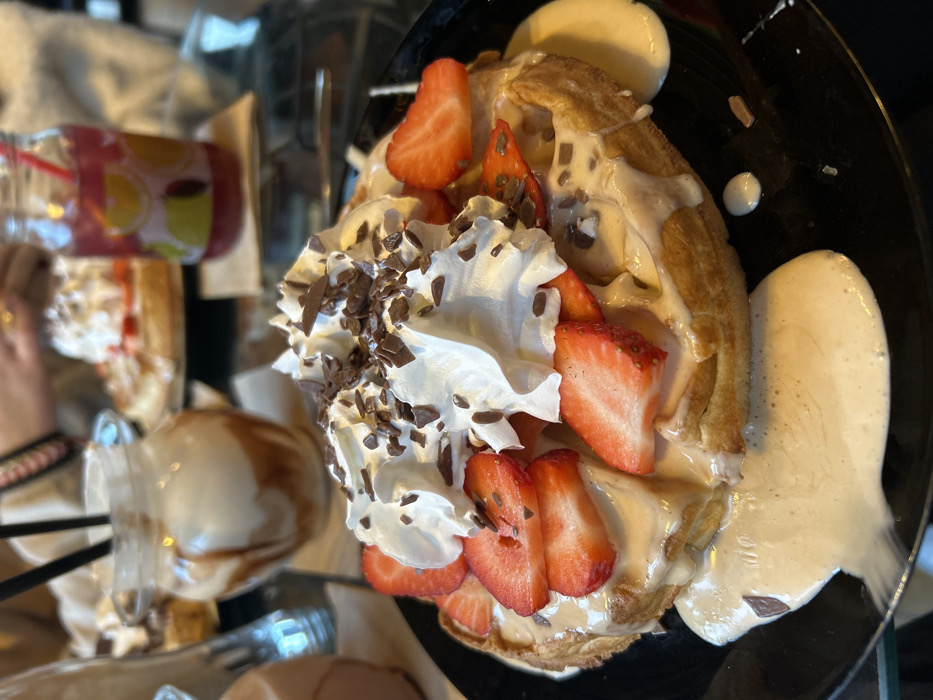 The image displays a close-up of a dessert presentation at a cafe or restaurant in Lovech, Bulgaria. A waffle, positioned on a black, glossy plate, is the primary subject. It is topped with white whipped cream, numerous slices of red strawberries, and dark chocolate shavings. A light-colored sauce coats the waffle and has pooled onto the black plate surface. In the blurred background, various items are visible on a dark, reflective table. These include a clear glass jar containing a layered beverage with two black straws, a glass beverage container with a red straw holding a reddish liquid and decorated with citrus patterns, and a second, out-of-focus waffle dessert with toppings. Portions of human hands are discernible in the background, indicating the presence of individuals.