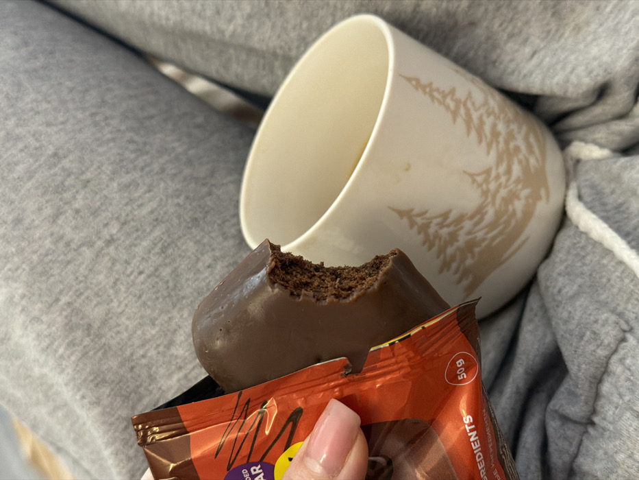 This image, taken in Perm, Russia, shows an individual's hand holding a partially eaten chocolate-covered cake bar. The dark brown bar has a significant bite mark revealing a crumbly, dark interior. It is partly encased in an orange and brown wrapper displaying "50g" and fragments of text, including "INGREDIENTS" and "RED SUGAR". The visible hand has manicured fingernails, painted a light pink hue. Adjacent to the bar, a white ceramic mug, adorned with light brown pine tree motifs, holds a light brown liquid. The mug rests on a grey, textured fabric surface, which features a white drawstring.