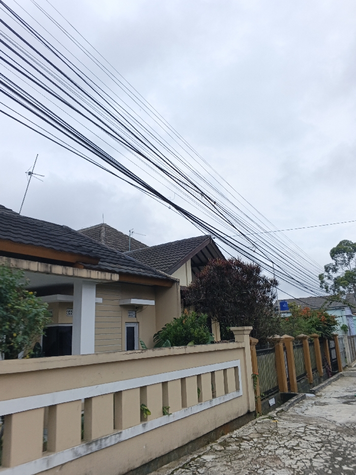 The scene, located in the city of Шчыткавіцкі сельскі Савет, Belarus, depicts a residential street view under an overcast, light gray sky. A dense array of approximately twenty to thirty dark electrical or communication cables runs diagonally across the upper portion of the frame, descending from left to right. Below these cables, several residential structures are visible. The closest house on the left features a light tan facade, a dark brown tiled roof with a prominent brown eave, and white support columns. An exterior television antenna is mounted on its roof. Adjacent to it, a second house with a similar dark tiled roof displays a peaked gable section with a mix of light tan and dark brown siding. In the immediate foreground, a light tan concrete or masonry fence runs horizontally, adorned with recessed rectangular panels. To the right, this fence transitions into a section featuring dark, vertically barred metal fencing interspersed with tan pillars. Green foliage and a dense, dark red/purple leafed shrub are situated behind the foreground fence. Further to the right, a blue cylindrical object is partially visible behind the fence line, with additional green trees in the distant background. The ground in the lower right corner consists of a cracked and uneven concrete or asphalt surface, indicating a pathway or sidewalk, with a narrow drainage channel running along the base of the foreground fence. No individuals or discernible actions are present within the frame.