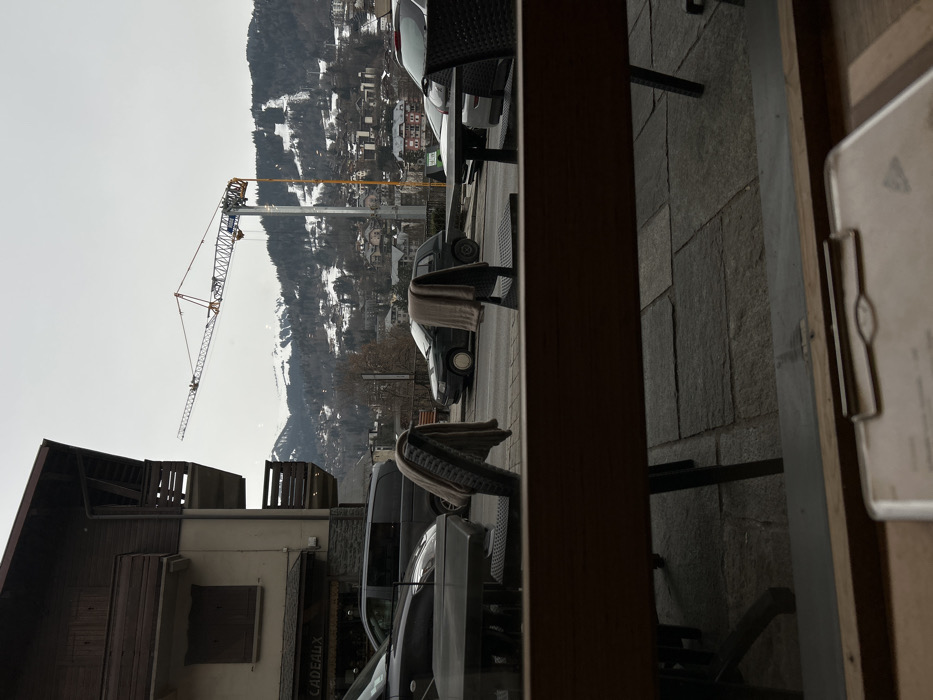 The image presents a view of the city of Saint-Gervais-les-Bains, France, observed from an interior position, looking outwards over a wooden windowsill or counter. In the immediate foreground, the top section of a light-colored clipboard, holding what appears to be a document or menu, rests on the counter. The midground features an outdoor paved area, likely a terrace or sidewalk, equipped with dark tables and chairs. Two chairs, centrally located, have light-colored, possibly knitted, fabrics draped over their backrests. Beyond this seating area is a paved street with three parked vehicles: a dark-colored SUV partially visible on the far left, a dark hatchback in the center, and a silver sedan on the right. To the left, a multi-story building with light-colored facade, dark wooden balconies, and closed brown shutters exhibits a partial sign reading "CADEAUX" above a storefront. The background is dominated by a prominent construction tower crane with a yellow jib, positioned right of center. Below the crane and extending across the horizon are numerous residential and commercial structures characteristic of a mountain town, interspersed with both bare and evergreen trees. Beyond the urban development, snow-covered mountains with visible ski slopes rise under an overcast, light gray sky. There are no individuals or active interactions visible in the scene.