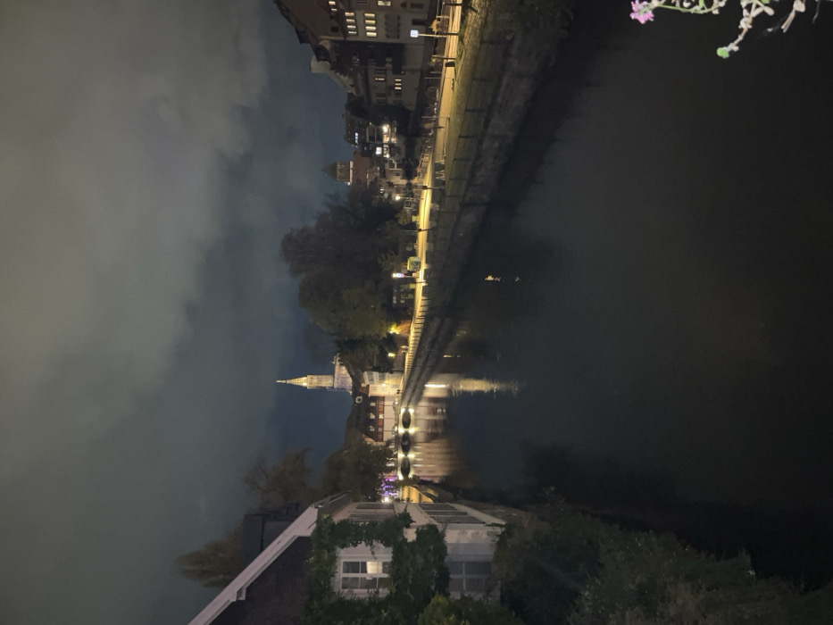 This nighttime image depicts a view along the Ill River in Strasbourg, France, specifically looking towards the Temple Neuf (Nouvelle Église) whose spire is visible in the distance. The scene is dominated by a dark, placid body of water, the Ill River, which occupies the lower and central portions of the frame. Its surface reflects the artificial lights from the surrounding urban environment, creating vertical streaks and inverted images of structures. On the left bank, a multi-story building with a light-colored facade and a dark, sloped roof is prominent in the foreground. Green foliage, likely ivy, covers parts of its exterior walls. Multiple windows with visible shutters are present on this structure. Further down the left bank, past this foreground building, additional illuminated structures and a multi-arched bridge are visible, their lights also reflecting on the water. The right bank features a well-lit paved walkway or street, bordered by a low stone wall and a line of mature trees. Several streetlights illuminate this path. Beyond the trees and walkway, a dense collection of historic buildings rises, some with illuminated windows. A distinct, dome-topped structure is visible among these buildings further along the right bank. In the mid-ground, centered visually but further down the river, the tall, slender spire of the Temple Neuf church stands out against the dark, cloudy night sky, illuminated by external lighting. The sky above is completely overcast, showing varying shades of dark gray and blue. No individuals are discernible within the frame. A single pink flower stem with a bloom is visible in the extreme lower right foreground, partially obscuring the view of the river. The overall lighting is artificial, relying on streetlights, building illumination, and reflections to define the scene under a heavily clouded sky.