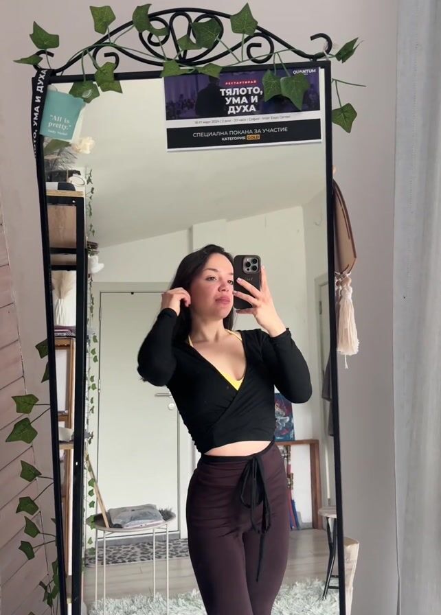 A young woman takes a selfie in a mirror. She has long, dark hair and is wearing a black crop top over a yellow bra top and brown drawstring pants. She is holding her phone up and looking at the screen. The mirror is framed with black metal and decorated with faux ivy. There is a poster on the mirror in Bulgarian. The room is tidy, with a shelf on the left side of the mirror and a white curtain on the right. The background is blurred, but appears to be a room with furniture and decorations. There is music playing.