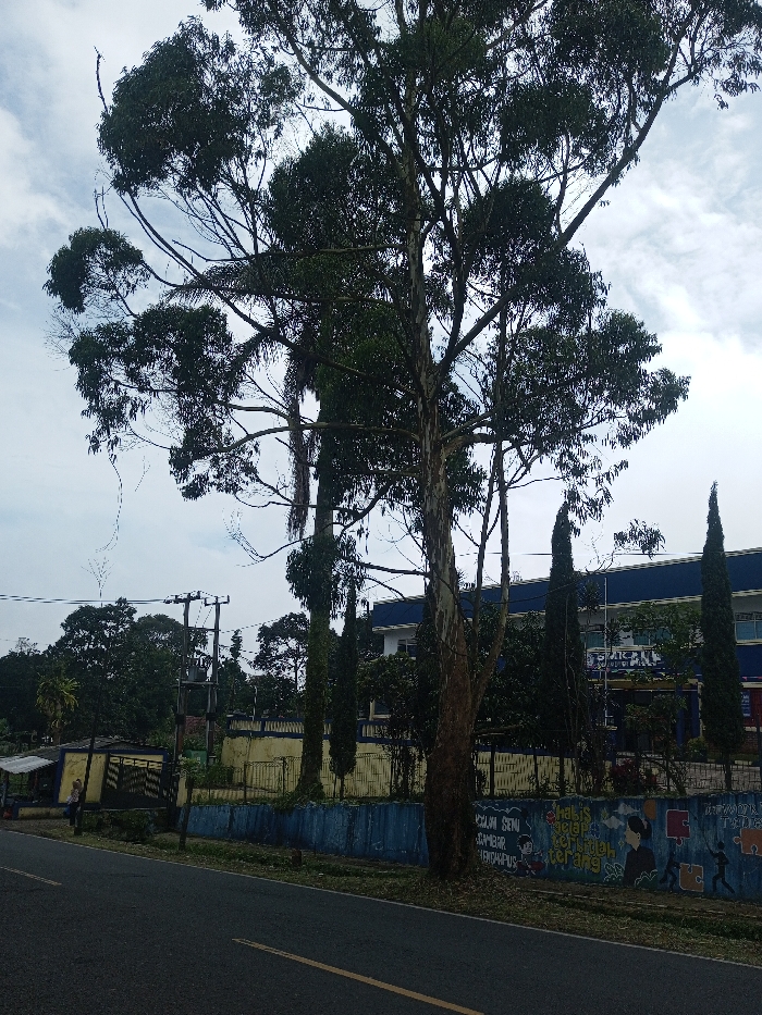 This image depicts an outdoor street scene in Sandamal Eliya, Sri Lanka, under an overcast sky. In the foreground, a dark asphalt road with a faded yellow center line extends from the bottom of the frame. To the immediate right of the road, a narrow strip of dirt and sparse vegetation leads to a low, blue concrete wall. This wall is covered with multi-colored graffiti murals, which include stylized human figures, puzzle pieces, and white text. Behind this blue wall, a taller, yellow-painted wall topped with black metal fencing is visible. The midground is dominated by several tall trees. A large tree with a distinctive light-colored, textured, and partially peeling bark stands prominently to the right of the center, its branches and dark green foliage extending towards the top of the frame. Behind the walls, several slender, conical, dark green trees are visible. To the far left, a utility pole supporting a transformer and multiple power lines stands against the sky, partially obscured by other dense green tree foliage. Adjacent to the road on the far left, a small, simple structure with a light-colored corrugated metal roof is visible, appearing to be a roadside stall or shelter. A single individual is standing near this structure, partially obscured. In the background, a multi-story building with a blue facade and white architectural trim is partially visible through the trees and above the walls. A sign affixed to the building's front facade appears to display the letters "SMKN". The sky is light grey with scattered white clouds, indicating an overcast condition.