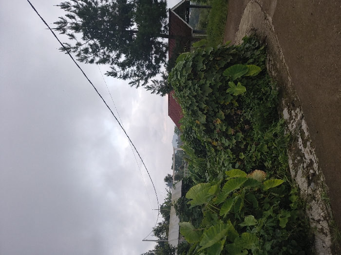 The image depicts an overcast outdoor scene in An Khe Ward, Vietnam. The sky is uniformly light grey with dense cloud cover, occupying the upper two-fifths of the frame. Multiple black electrical or telephone lines span diagonally across the sky from the upper left to the upper right. The landscape is dominated by lush green vegetation. In the foreground, a two-tone paved path is visible, consisting of a darker brown asphalt or dirt road on the right and a lighter grey concrete curb or drainage area to the left, which shows signs of light-colored residue or wear. Dense foliage, including large-leafed plants (possibly taro or similar species) and thick vines, forms a prominent green mound that extends from the mid-ground left towards the right, separating the path from background elements. Behind this vegetation, a tall, dark green pine-like tree stands prominently on the right. To its left, a structure with a dark red tiled roof and open sides, resembling a gazebo or shelter, is partially visible. Further to the left, behind more greenery, another building with a reddish-brown tiled roof can be seen. No individuals or specific actions are visible within the frame. The overall impression is one of a rural or semi-rural setting with abundant natural growth and modest structures under a dull sky.
