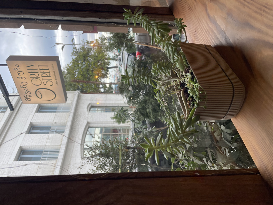 The scene is viewed from inside a building, looking out a window onto a city street in Batumi, Georgia. In the immediate foreground, a polished dark brown wooden window sill occupies the lower portion of the frame. Resting on the sill is a light beige/tan, fluted rectangular planter containing multiple succulents, including a String of Pearls (Senecio rowleyanus) and other unidentified leafy varieties. The window frame itself, made of dark brown wood, is visible on the left and right edges. Through the window, an urban streetscape is visible under an overcast sky. A prominent square-shaped sign, illuminated and hanging from a black metal fixture, is positioned slightly right of center. It displays Georgian script at the top, followed by "GREEN STREET" in large English capital letters, and "coffee. breakfast. drinks" in smaller English text below. Across the street, a multi-story building with a textured, possibly stucco or painted brick, white exterior is visible. It features several arched windows on the lower level and rectangular windows with light blue frames and simple metal balconies on the upper floor. Various green trees and dense shrubs are present both in front of and around this building, partially obscuring the street level. In the background, obscured by foliage, a dark-colored vehicle is partially visible on the street, and a streetlight pole stands near the horizon. No individuals are depicted within the frame.
