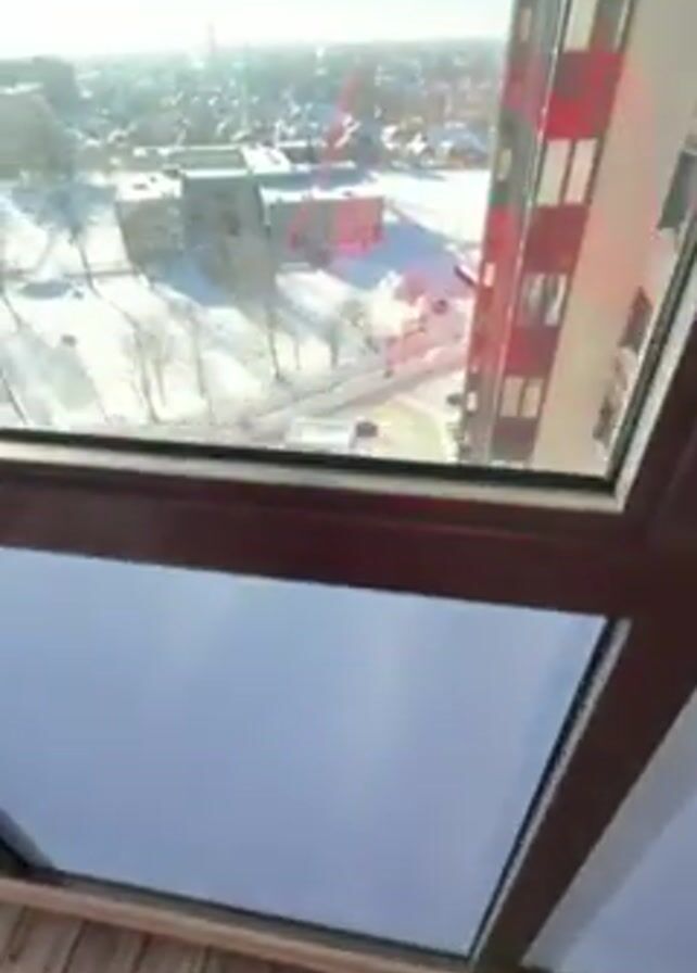 The video begins looking at a skylight from inside a room with wooden floor. It then switches to a view from a high-rise window, showing a winter scene with snow-covered ground and buildings. There are cars parked in a lot and bare trees are visible. In the distance, the hazy silhouette of a city can be seen on the horizon. The sun is shining brightly. The camera zooms in slightly on the top of a large building.