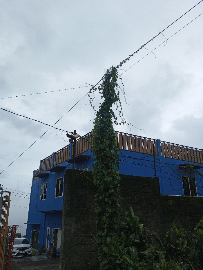 The scene depicts an outdoor urban environment in Ciherang, Indonesia, under an overcast sky. A tall, dark utility pole heavily overgrown with dense green vines occupies the central foreground, extending vertically and supporting multiple black electrical wires that crisscross the upper frame. A yellow-orange street light fixture is mounted near the top of the pole, partially obscured by foliage. In the mid-ground, a two-story building painted a vibrant blue is visible. The upper story features a balcony with a light brown, slatted railing. The lower story has multiple rectangular windows with white frames and an open entrance to the left, revealing interior shadow. A dark, moss-covered concrete wall runs horizontally in front of the lower portion of the blue building, with barbed wire visible along its top. To the far left, a partially open rusty orange metal gate reveals a white Honda Mobilio parked on a paved surface. Two individuals are seated on small chairs or stools near the open entrance of the blue building, to the left of its main structure. Additional broad-leafed green vegetation is present in the lower right foreground, growing near the base of the concrete wall.