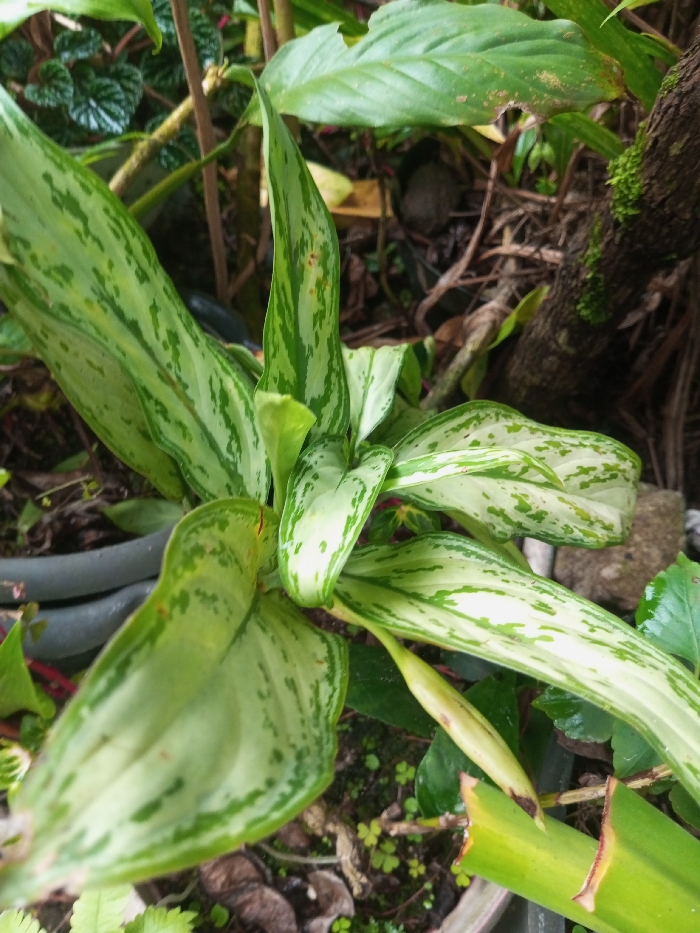 The image displays a detailed, close-up view of a variegated plant, consistent with an Aglaonema (Chinese Evergreen). Its broad, lanceolate leaves exhibit an irregular pattern of light green and darker green mottling. Several leaves show small reddish-brown spots or minor damage. In the background, various green foliage is visible, including a section of a dark brown tree trunk covered with green moss on the right side. Dark soil or mulch is present beneath the plants. A dark grey flexible hose or pipe is partially visible on the left side of the frame. The lower right foreground reveals a segment of a light green plant stem, cleanly cut at an angle, and the upper rim of a terracotta-colored pot. No individuals or specific actions are depicted. The exact location in the city of Pandaria, India, cannot be ascertained from the visual evidence provided.
