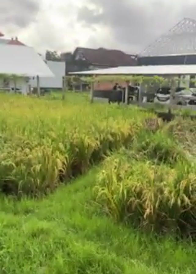 The camera pans across a rural scene featuring a rice paddy in the foreground