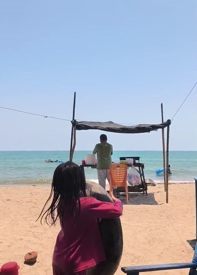 The scene is a sunny beach. A young girl in pink pajamas is standing on the sand, holding a large tire around her middle. She looks up and smiles. Behind her is a small shaded stall where a man in a green shirt is preparing something. In the background, people are swimming and playing in the water. There are also blue benches nearby.