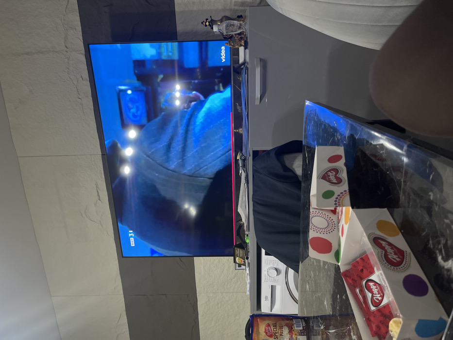 This image depicts an interior scene within a residential property in Plovdiv, Bulgaria, observed from a low angle. A seated individual's leg is visible in the lower right foreground. Directly in front of the viewer is a dark, reflective rectangular table upon which an opened white cardboard box, adorned with colorful polka dots and "Happy" branding, contains red "Happy" snack packets. To the left, a transparent bottle of "Cooking Chef Special Pasta" stands. In the mid-ground, a white front-loading washing machine is partially visible, situated beneath a flat-screen television. A dark blue garment is draped over an object in front of the washing machine. The television is mounted on a gray media console, displaying a program featuring the back or side profile of a person in a blue-toned jacket. The channel identifier "БНТ 3" and "31" are visible in the top left corner of the screen, with "video" in the bottom right. Multiple bright light reflections are present on the television screen. Small decorative items, including a figurine and a miniature car, are arranged on the media console. The wall behind the television is clad with textured, rectangular panels in two horizontal bands, a lighter tone above a darker gray.