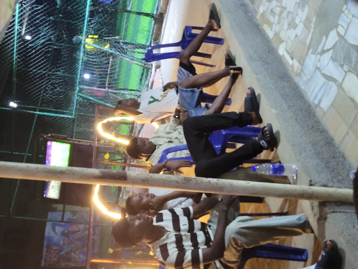 Several people sit on blue plastic chairs in an outdoor setting. They are positioned parallel to a wall, and some have their legs stretched out. A water bottle rests on the ground beside one of the chairs. In the background, there's a sports field with netting and visible lighting. A television screen is visible in the left part of the background. The overall scene gives the impression of a casual gathering or watching an event.