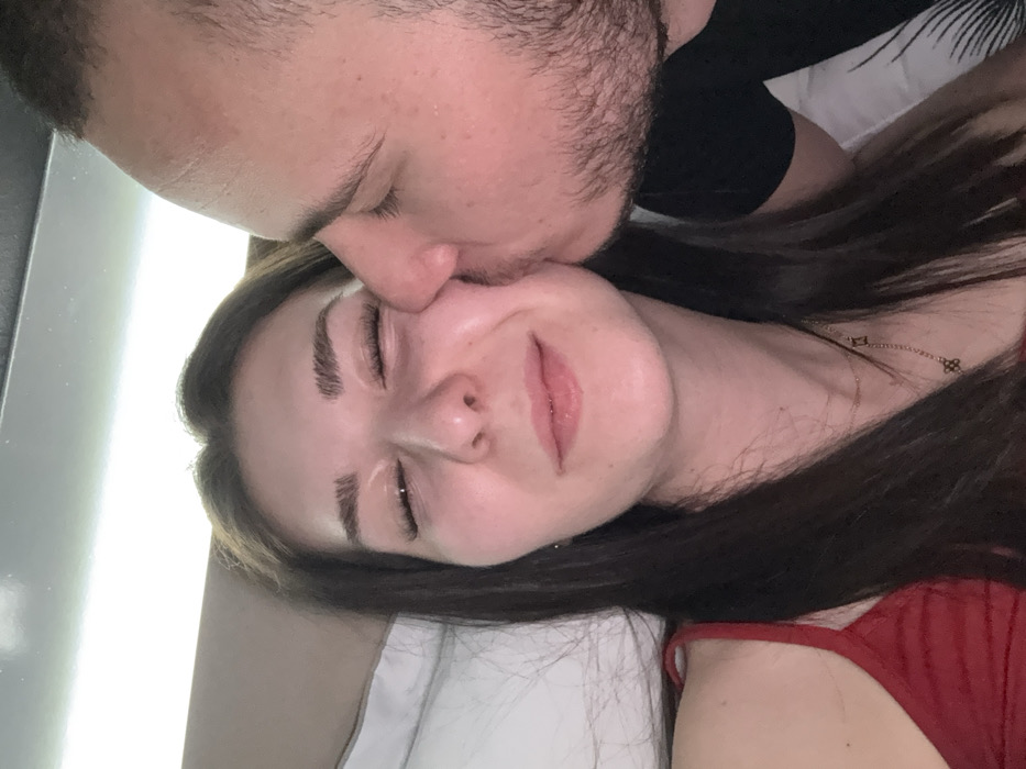 A close-up image depicts two individuals, one female and one male, engaged in an intimate interaction within an indoor setting. The female, positioned on the left, has long dark hair and wears a red spaghetti strap top with a delicate gold-toned necklace. Her eyes are closed, and her mouth exhibits a soft, closed-lip smile. The male, positioned to her right, displays short dark hair and facial stubble, and is actively kissing her left cheek. He is attired in a dark shirt. The background is softly blurred, revealing light-colored bedding or a pillow behind the female's head, and an indistinct lighter surface above. No specific features indicating a location within the city of Plovdiv, Bulgaria, are discernible from the visual content.