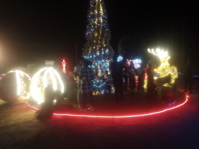 A night scene showcases holiday decorations