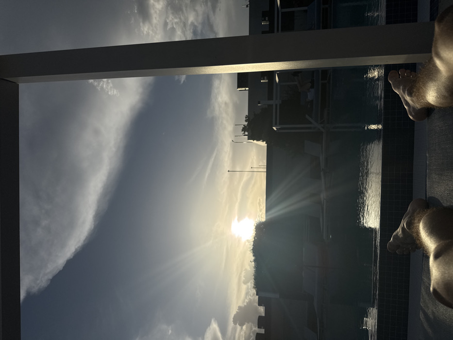 This image depicts a rooftop pool deck scene during late afternoon or early evening, likely at the AC Hotel Gainesville Downtown, located in Gainesville, Florida, United States of America. In the immediate foreground, the bare lower legs and feet of an individual are visible, resting on a dark surface, presumably a lounge chair. The individual's body hair is noticeable on the legs. A prominent white, rectangular structural pillar occupies the right side of the frame, extending from the bottom to near the top, while a dark horizontal beam traverses the top edge of the image. The midground features a rectangular swimming pool with visible dark tiling along its edge. The pool water exhibits reflections of the sky and light. Several empty white sun loungers are arranged around the pool's perimeter. Two white, open-sided cabanas are situated on the far side of the pool to the right; a reclining person is partially visible within the more distant cabana. The background is dominated by a low-lying sun, positioned slightly to the left of the frame's center, emitting intense light and producing lens flare. The sun is partially obscured by foliage from a tree or shrub. Behind this, a dark building with decorative crenelated architectural features is visible on the left. Further back, multiple dark-colored buildings with flat roofs and exposed utilities (antennae, pipes) are discernible against a cloudy sky. The sky transitions from a lighter, hazy blue near the horizon to a darker grey, with prominent wispy and layered cloud formations.