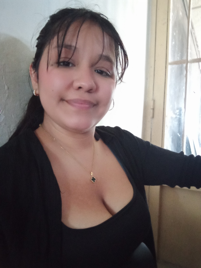 A close-up portrait depicts a female individual with a light-to-medium complexion, dark hair styled back with bangs, and a subtle closed-mouth smile. She is wearing small gold-toned hoop earrings and a thin gold-toned necklace featuring a black four-leaf clover pendant with a gold-toned border. Her attire includes a low-cut black tank top or camisole worn beneath an open black cardigan or long-sleeved top. The background consists of a light-colored wall exhibiting minor texture or wear on the left, and a window or light-colored framed door with vertical and horizontal divisions, allowing light to enter, on the right. The setting is indoors. The specific location within the city of Valencia, Venezuela, cannot be determined from the visual evidence.