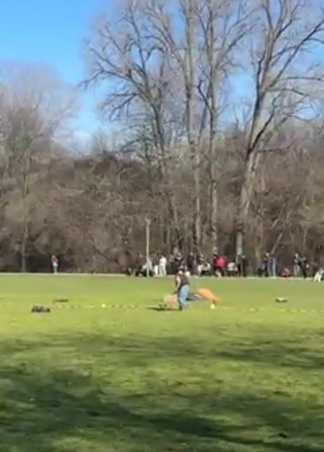 park scene with several remote-controlled cars driving on a grassy field. A man is kneeling down adjusting one of the cars. The other cars, one black and one orange, are jumping over obstacles on the field. There are bare trees in the background, and people are standing and sitting on a path beyond the field. A white seagull flies in front of the camera. The sky is bright blue.