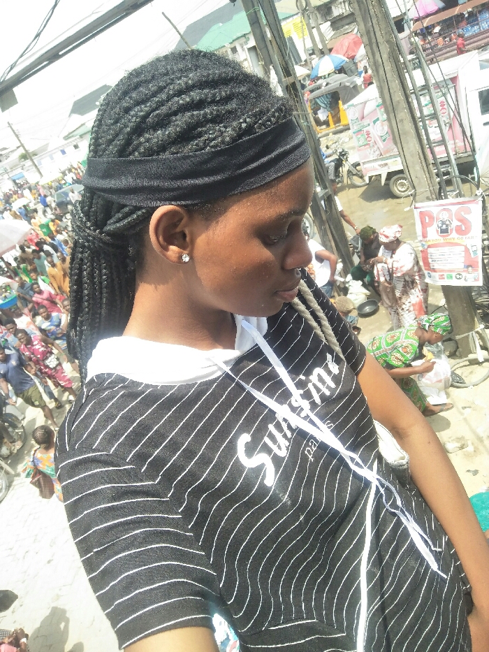The image depicts a young adult female in the foreground, positioned slightly above a bustling outdoor market scene in Ajah, Nigeria