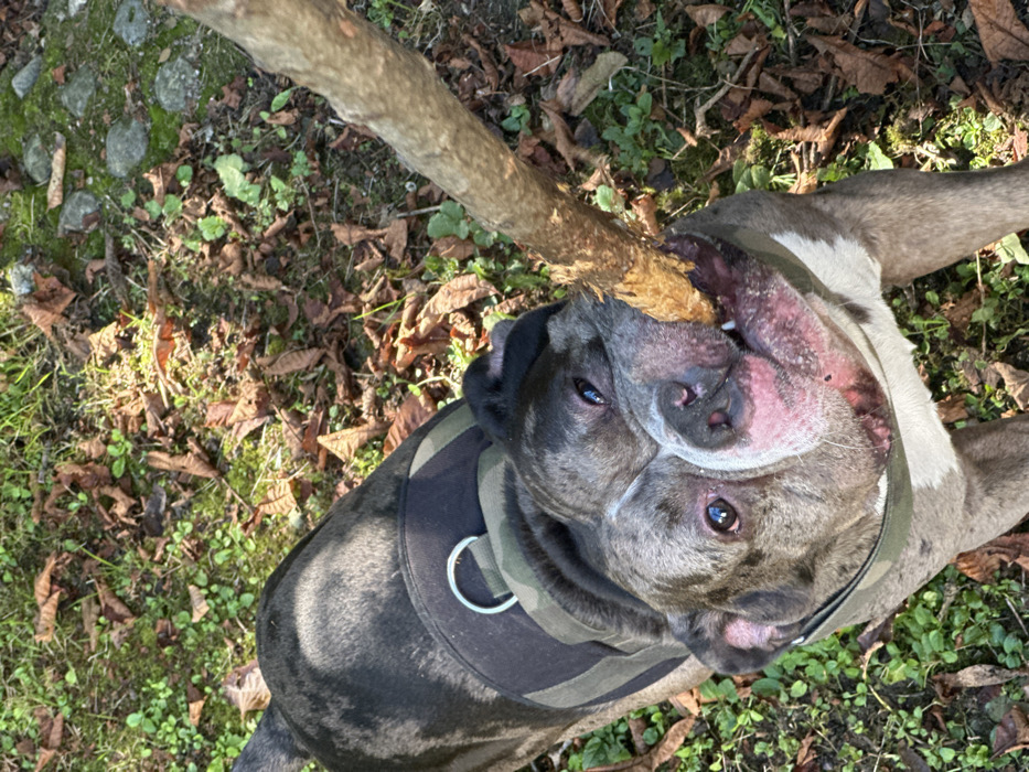 - "This image captures a blue merle American Bully-type dog engaged in chewing a wooden stick in an outdoor environment in Stains, France" by FM-clbjN2, licensed under CC BY 4.0