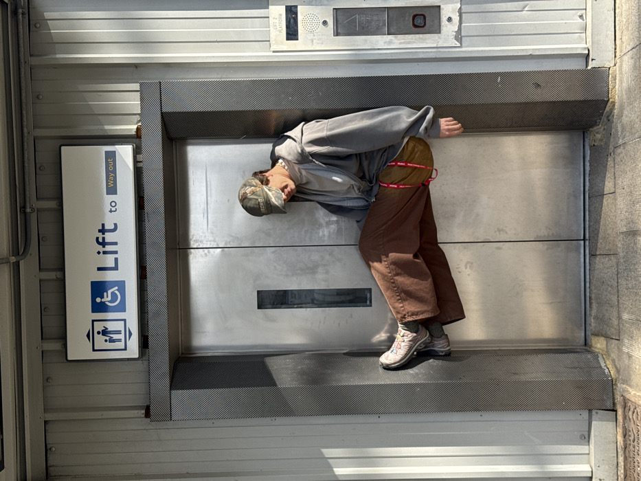 - "An individual is depicted in an unusual horizontal pose against closed, brushed metallic elevator doors within a transport station environment in London, United Kingdom" by FM-jCIl63, licensed under CC BY 4.0