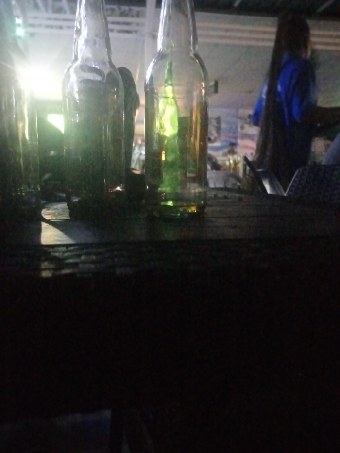 Several glass beer bottles sit on a dark table. One bottle is partially filled with a green liquid. A person with long hair and wearing a blue shirt stands in the background. The background appears to be a bar or restaurant setting. The lighting is low, casting shadows across the scene. The table appears to be made of a rough or textured material.
