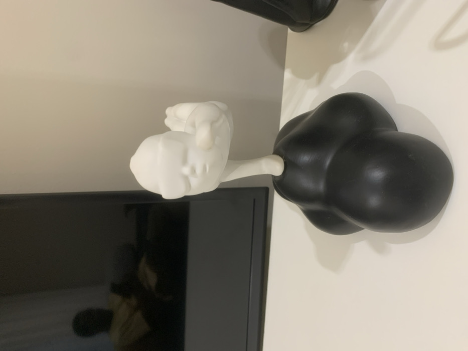 A white sculpture of a head with an arm raised, seemingly resting on or connected to a black, rounded object resembling a cloud or bulbous form. The sculpture and object are positioned on a white surface, possibly a shelf or table. A black television screen is visible in the lower-left corner of the frame, reflecting elements of the room. The composition is set against a light gray wall.