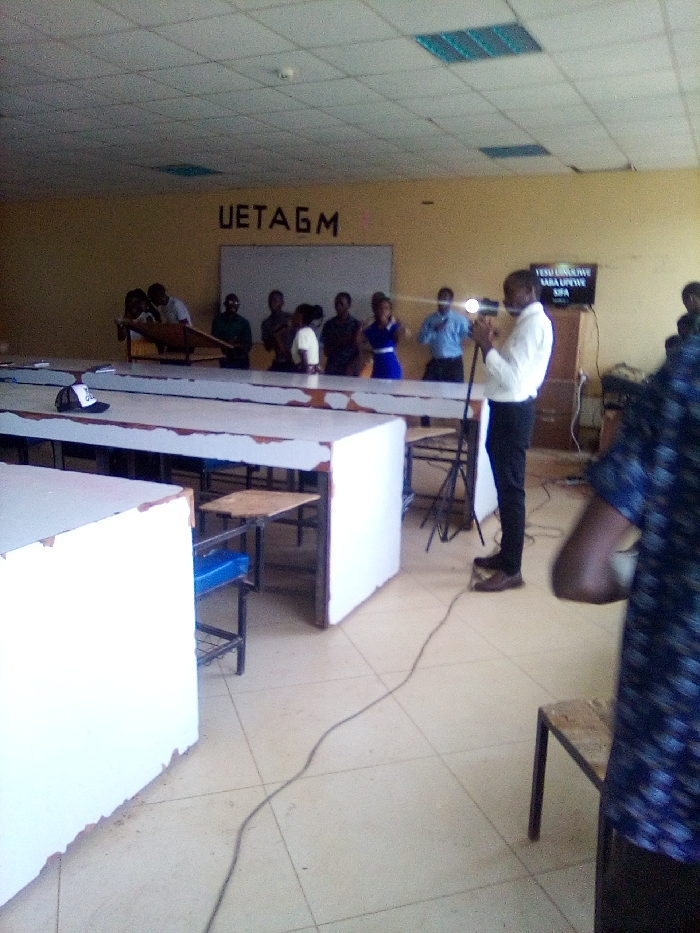 The scene depicts an indoor gathering, likely within a classroom or lecture hall, located in Bondo, Kenya. The room features light-colored walls, a tiled floor, and a suspended ceiling with recessed lighting fixtures. On the back wall, the letters "UETAGM" are displayed above a large white board, with a television screen to its right showing text in a local language ("YESU UMEUWE SARA UPEWE SHA"). In the foreground, the partial upper body of an individual in a blue patterned shirt is visible on the right. Directly behind a row of large, white, rectangular tables, an individual in a white long-sleeved shirt and dark trousers operates a camera mounted on a tripod. The camera emits a visible light source and is directed towards a group of approximately eight to nine individuals standing at the far end of the room. This group is positioned behind another large table or podium. Two individuals on the far left of this group are leaning over a tilted surface, possibly a drawing board. The other members of the group stand upright; one woman wears a blue dress, and another individual wears a light yellow shirt. A black electrical cable extends across the tiled floor from the camera setup. A black and white cap rests on one of the tables in the mid-ground. Individual classroom chairs with attached writing surfaces are visible between the tables.