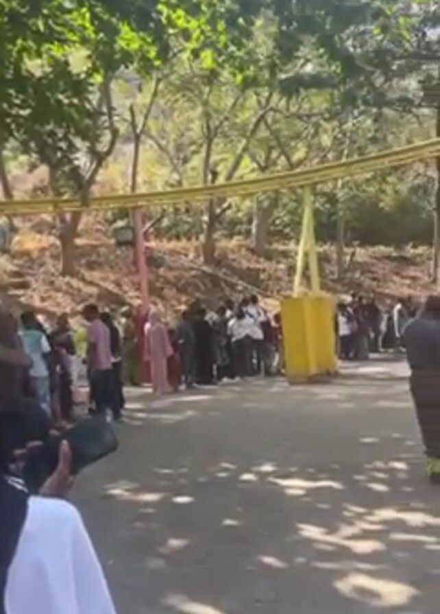 crowd of people gathered near a fairground ride. The ride structure is visible, painted in bright colors like yellow, purple, and blue. Individuals of various ages and clothing styles are present, including some wearing hijabs. Some people appear to be queuing or waiting near the ride, while others seem to be walking around. The background features trees and a hillside. A uniformed worker is visible in the middle of the frame. Food stalls are visible under the ride structure.