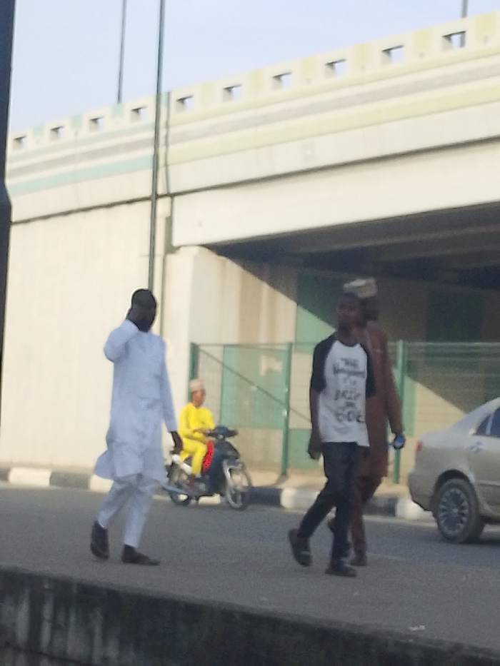 Three men cross a street beneath a concrete overpass. One man, dressed in white, is on the left, talking on a mobile phone. Another man wearing a white t-shirt with black sleeves is walking on the right. A third man in brown is also walking on the right. A person on a motorbike dressed in yellow sits waiting behind the walkers. A car is also visible in the background to the right.