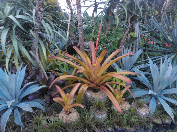 This image displays a close-up view of a diverse botanical arrangement within an outdoor garden setting in Kladno, Czechia. The foreground and midground are dominated by various succulent and epiphytic plants. Centrally positioned is a large bromeliad with rosette-forming leaves exhibiting a transition from green to reddish-orange hues, from which a single, elongated red inflorescence protrudes upwards. To its lower left, two smaller, similarly colored bromeliads are visible, each appearing to be planted in a distinct, light-colored mound of substrate. Several large, blue-green agave-type plants with stiff, pointed leaves are arranged around these central features, notably on the lower left and extending into the mid-right. The ground immediately surrounding these plants is covered with fine, grass-like vegetation, some also appearing to be in small, individual containers or wrapped bases. In the background, multiple slender tree trunks are discernible, with some supporting epiphytic plants characterized by long, strap-like green leaves. Densely packed green foliage, interspersed with clusters of small red flowers, occupies the deeper background, particularly towards the upper right. The scene is static, devoid of human figures, animals, or any discernible activity. The lighting is even and diffused, suggesting overcast conditions or a shaded area.
