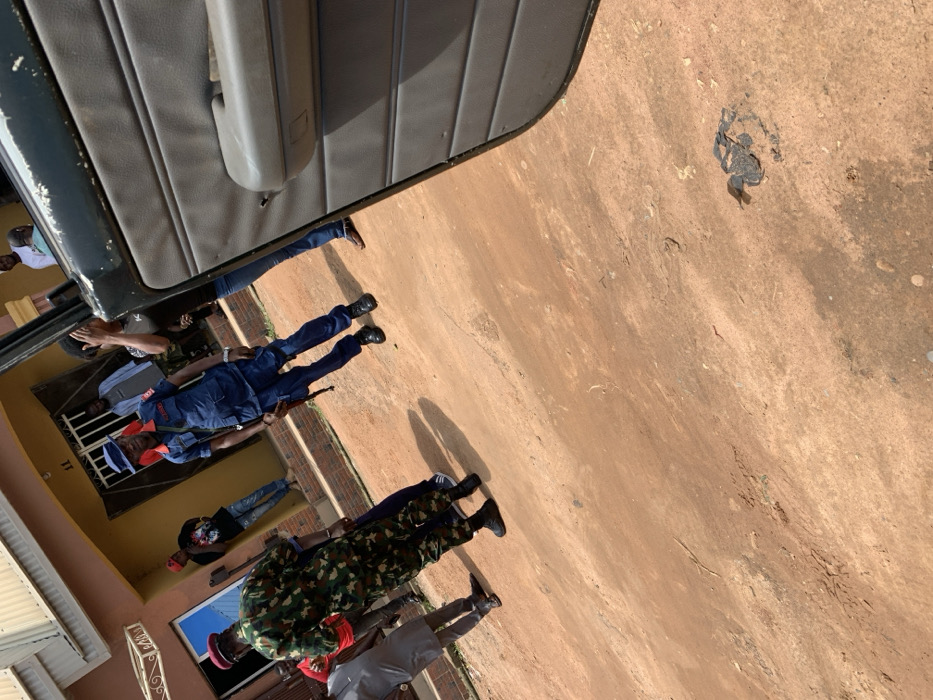 The image displays an outdoor scene in Zaki Biyem, Nigeria, with a group of individuals gathered on a reddish-brown dirt ground in front of a light brown two-story building. In the midground, a man in a blue uniform, blue cap with red trim, and black boots stands facing the camera, carrying a dark rifle slung across his chest. To his left, another man in a green camouflage military uniform and red beret stands with his back to the camera. Several other individuals are present in the background and midground, dressed in civilian clothing; one wears a grey traditional garment, and another is in a red shirt and jeans on the building's steps. The building's facade features the number '11' above a metallic gate. On the right side of the frame, the front passenger door of a dark green vehicle is open, showing its grey interior panel. On the dirt ground in the lower right, a small, dark, irregular piece of debris is present. The scene is illuminated by daylight, casting shadows.