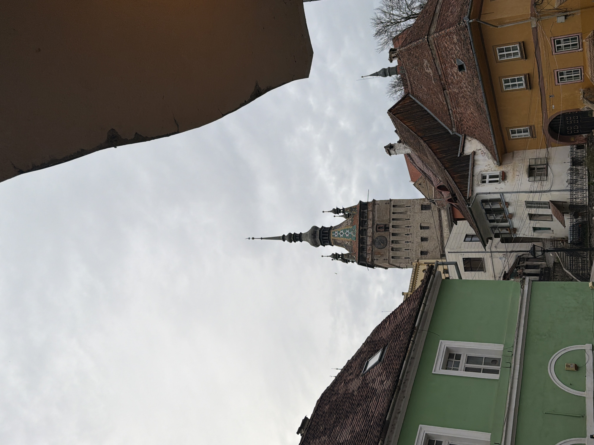 view of Sighișoara's Clock Tower from a low angle. The tower dominates the frame, rising above the surrounding buildings. The lower part of the image is framed by the eaves of buildings with red and green tile roofs. The sky is overcast. Other buildings with various architecture, including yellow buildings, are also visible.
