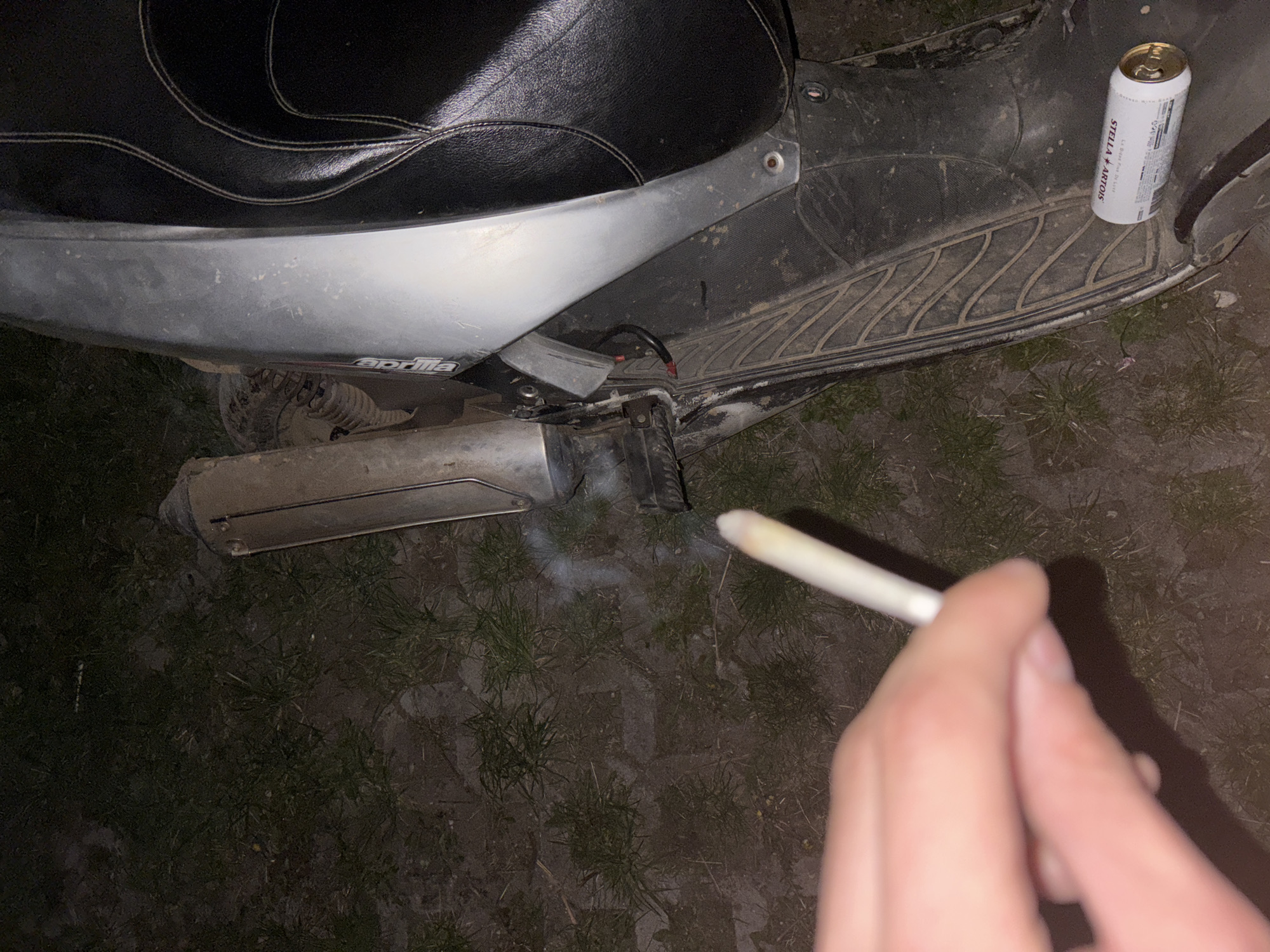 A nighttime image presents a partially visible Aprilia scooter on cracked dirt and sparse grass in an unknown location. The scooter has a black seat, silver body panels, and a visible exhaust pipe emitting smoke. A can of Stella Artois beer sits on the scooter's running board. A lit cigarette is held in a hand, obscuring a portion of the scene. There are no visible indicators to confirm the location is Lyulin, Bulgaria.