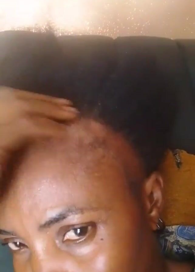 close-up shot of a person's face and hairline. The person has dark skin and short, dark hair that appears to be receding at the hairline. They are moving their hand across their forehead, possibly highlighting the receding hairline. The background is blurry, showing a couch or bed with a pillow and a wall. The lighting is a bit dim, but the person's face is clearly visible.