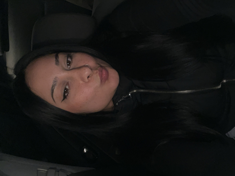 One adult female is depicted from the chest up, positioned inside what appears to be the passenger cabin of a vehicle. The scene is illuminated by low light, suggesting nighttime conditions. The subject has long, straight, dark hair, a complexion with visible freckles, and wears winged eyeliner. A small metallic ring is present in her left nostril. She is wearing a black long-sleeved top layered under a black puffer vest featuring a prominent silver zipper running down the front. Her lips are pursed in a 'kiss' expression, and her gaze is directed straight towards the camera. The immediate background is dark, with contours consistent with a car interior, including a dark headrest visible behind her right shoulder and a faint light source in the upper left corner of the frame. There are no visual cues within the image to determine a specific location within the city of Anthousa Municipal Unit, Greece, or any other geographical area.