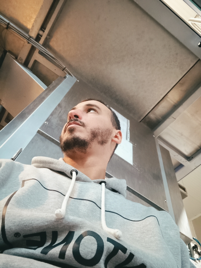 A man in a gray hoodie is seen from a low angle, gazing upwards. The hoodie has drawstrings and a large design with bold black letters. He has a short beard and mustache. The background features an industrial setting with exposed metal structures, pipes, and possibly part of a ceiling or mechanical equipment. The lighting is somewhat diffused, creating a neutral ambiance.