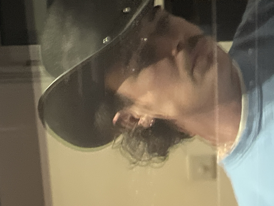 A man wearing a black baseball cap is partially visible. His face is angled slightly to the side, revealing his nose, chin, and curly hair. His light blue shirt is visible. The image is somewhat blurry and appears to be taken through a reflective surface. The background consists of light-colored walls and a visible electrical outlet.