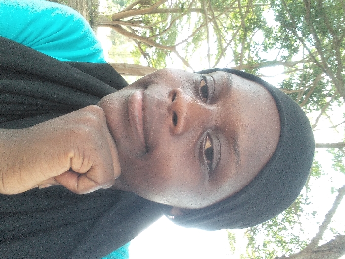 A close-up, outdoor portrait depicts an individual with dark skin, wearing a black head covering and a turquoise-colored shirt. The person is looking directly at the camera with a slight smile. Their right hand, fisted, supports their chin. The background consists of blurred green foliage and tree trunks, indicating a natural, open-air environment within the city of Osu, Nigeria. The lighting suggests daytime conditions.